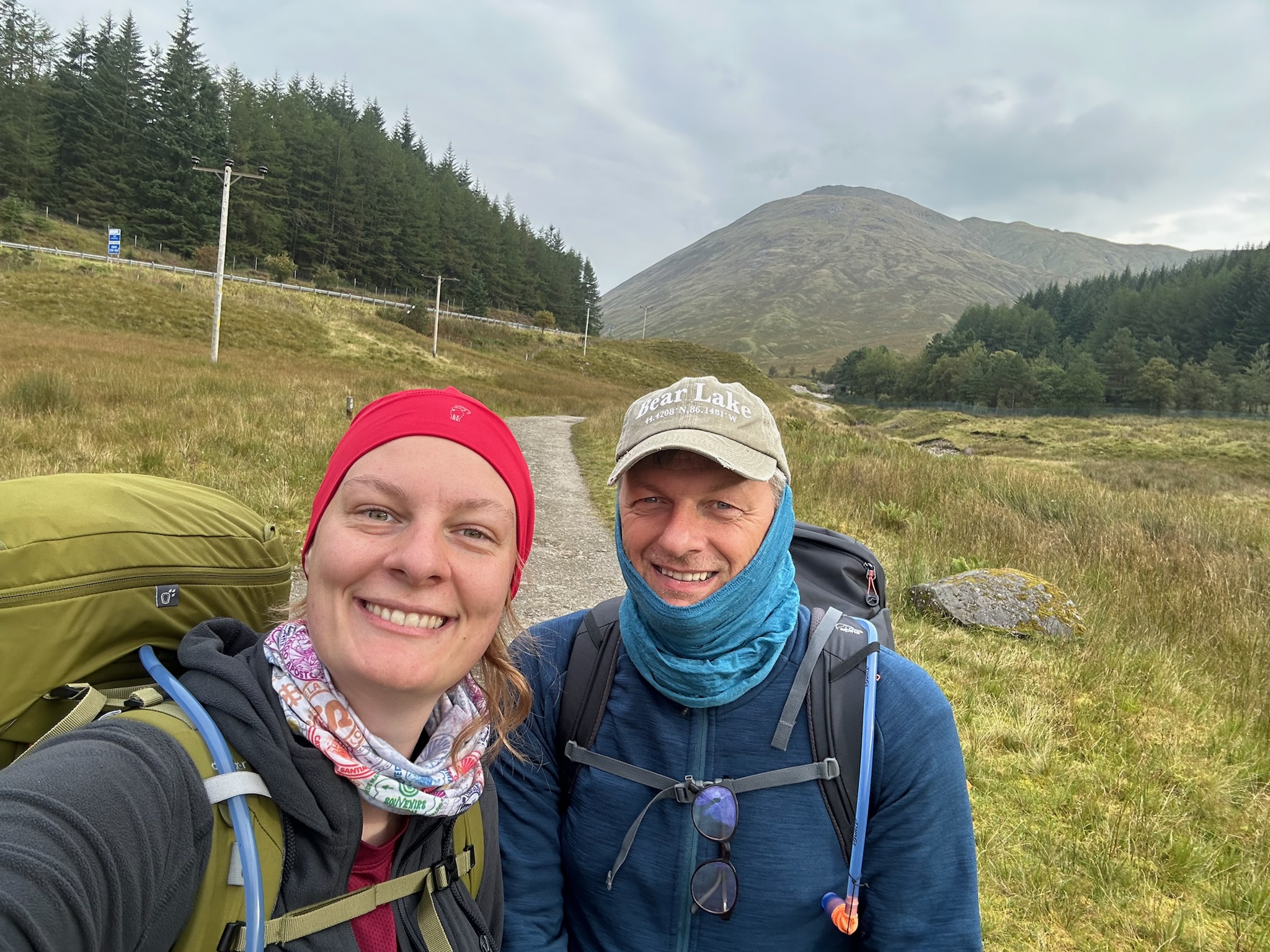 Die erste Etappe führte uns durch das Tal der schottischen Highlands, entlang der Eisenbahn und einer Autobahn. Klingt vielleicht nicht so spektakulär, war aber entspannt für den Körper. Trotzdem: Mit den beeindruckenden Abschnitten zuvor konnte dieser Teil nicht ganz mithalten. Am höchsten Punkt der ersten Etappe hielten wir an für ein Frühstück – und eine fröhliche Suche nach dem Sonnenschein. Jedes Mal, wenn wir ein bisschen blauen Himmel sahen, freuten wir uns wie kleine Kinder an Weihnachten.