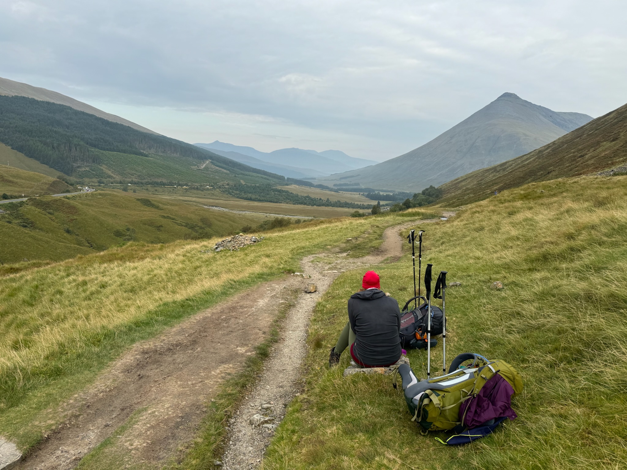 Der Aufstieg war mit dem schweren Gepäck zwar mühsam, und ich hielt uns tempo-technisch auch etwas auf (hust hust), aber hey – jeder läuft den West Highland Way in seinem eigenen Tempo, oder? Eine Gruppe junger Dänen überholte uns mit vollem Schwung und schwerem Gepäck.