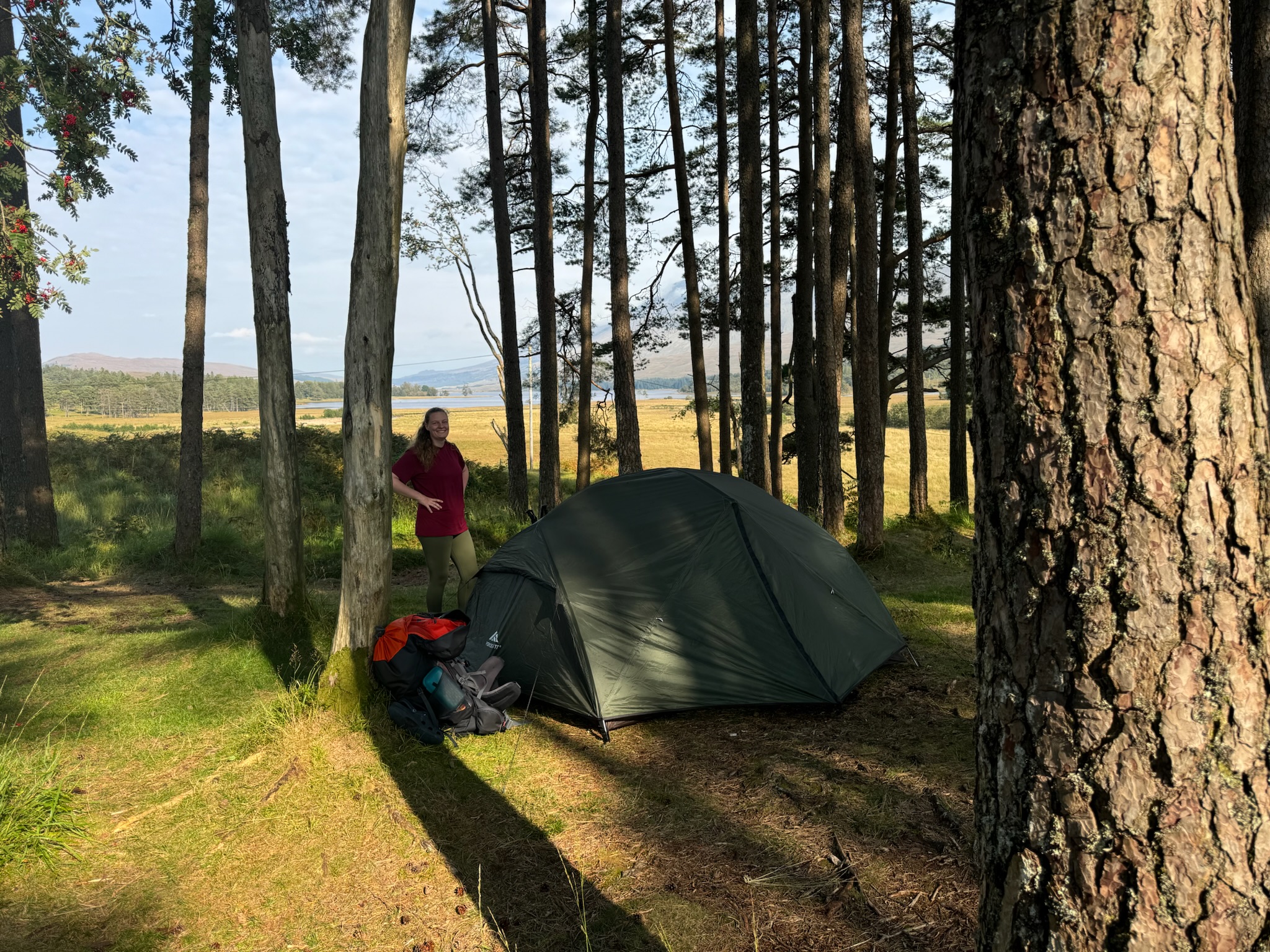 Das Zelt war schnell aufgebaut (Wanderschuhe gegen Crocs getauscht, wie immer), und wir richteten uns häuslich ein. Auch von unserem Zelt aus hatten wir einen schönen Blick auf das Loch Tulla. Da es erst 16:30 Uhr war, entspannten wir uns noch ein wenig im Zelt und versuchten, uns gegenseitig vom Einschlafen abzuhalten.