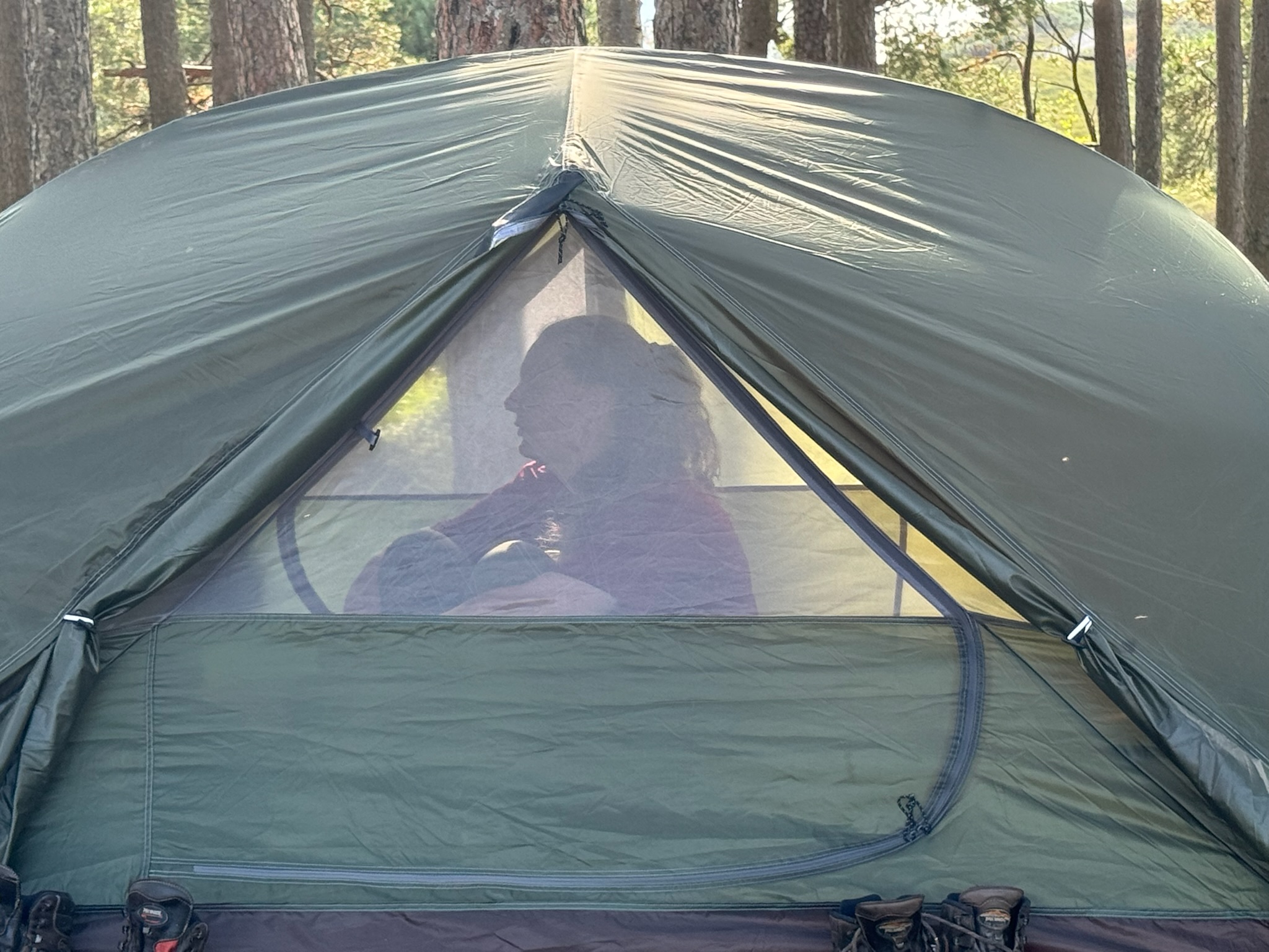 Nachts wurden Papa und ich plötzlich von einem seltsamen Geräusch geweckt – ein schrilles, zweittöniges Schreien. Wir sind uns nicht sicher, was es war, aber vermutlich ein nachtaktiver Vogel. Der Gedanke, dass es etwas mit Flügeln war, war jedenfalls beruhigender, als an etwas Vierbeiniges zu denken, das sich in der Nähe herumtreibt. Nach dem kurzen Schrecken schliefen wir schnell wieder ein. Wandern macht halt einfach müde.