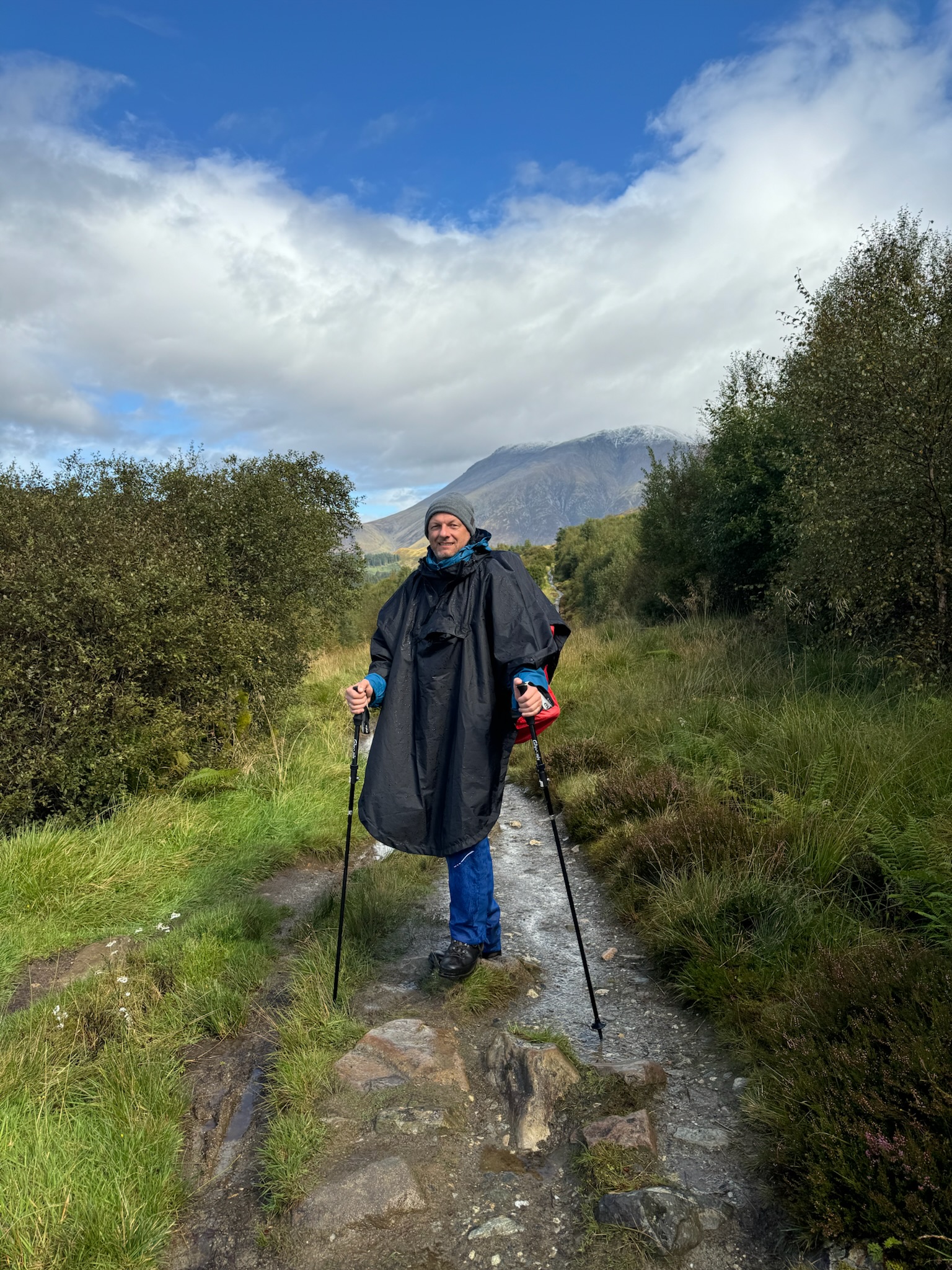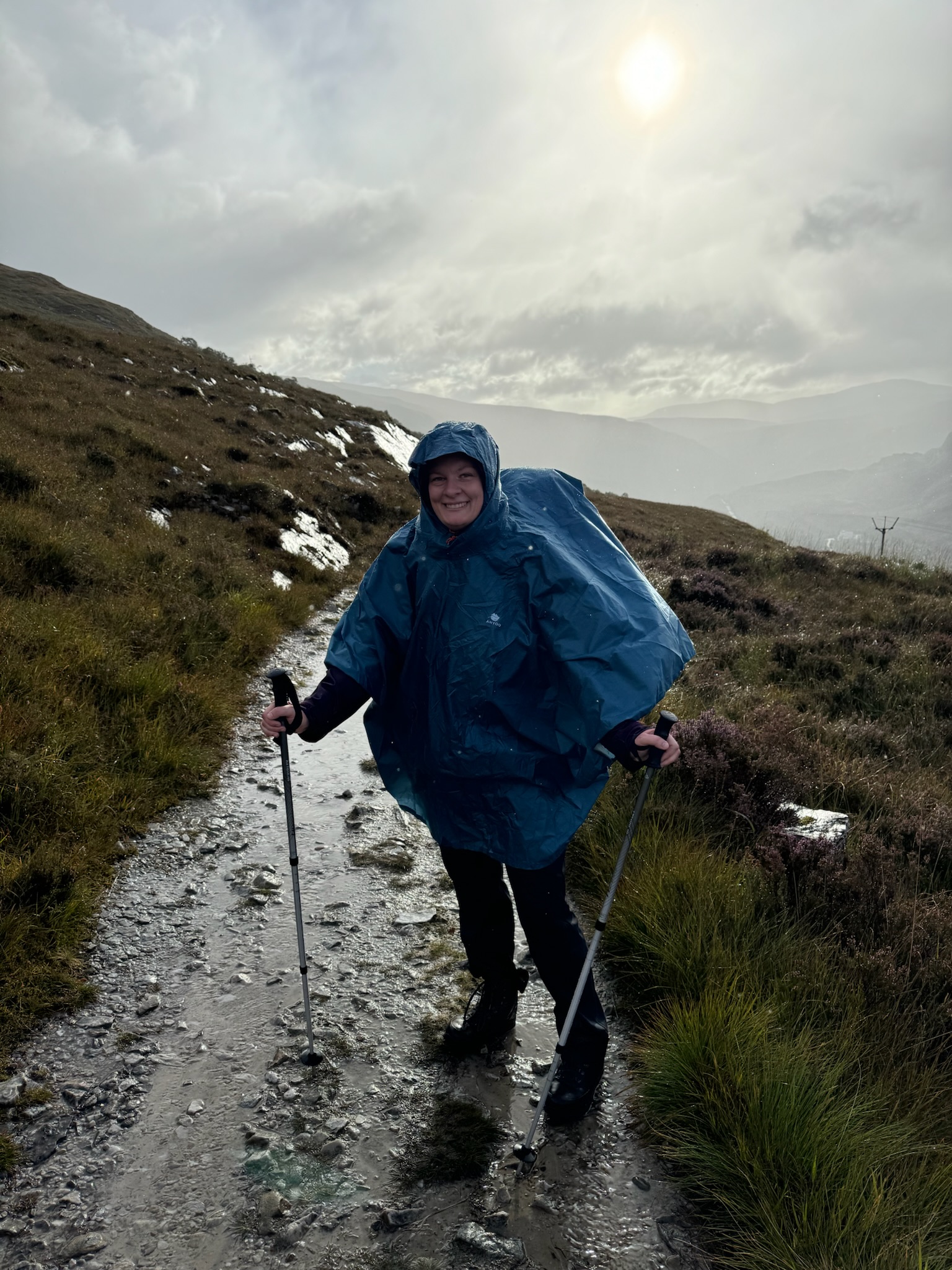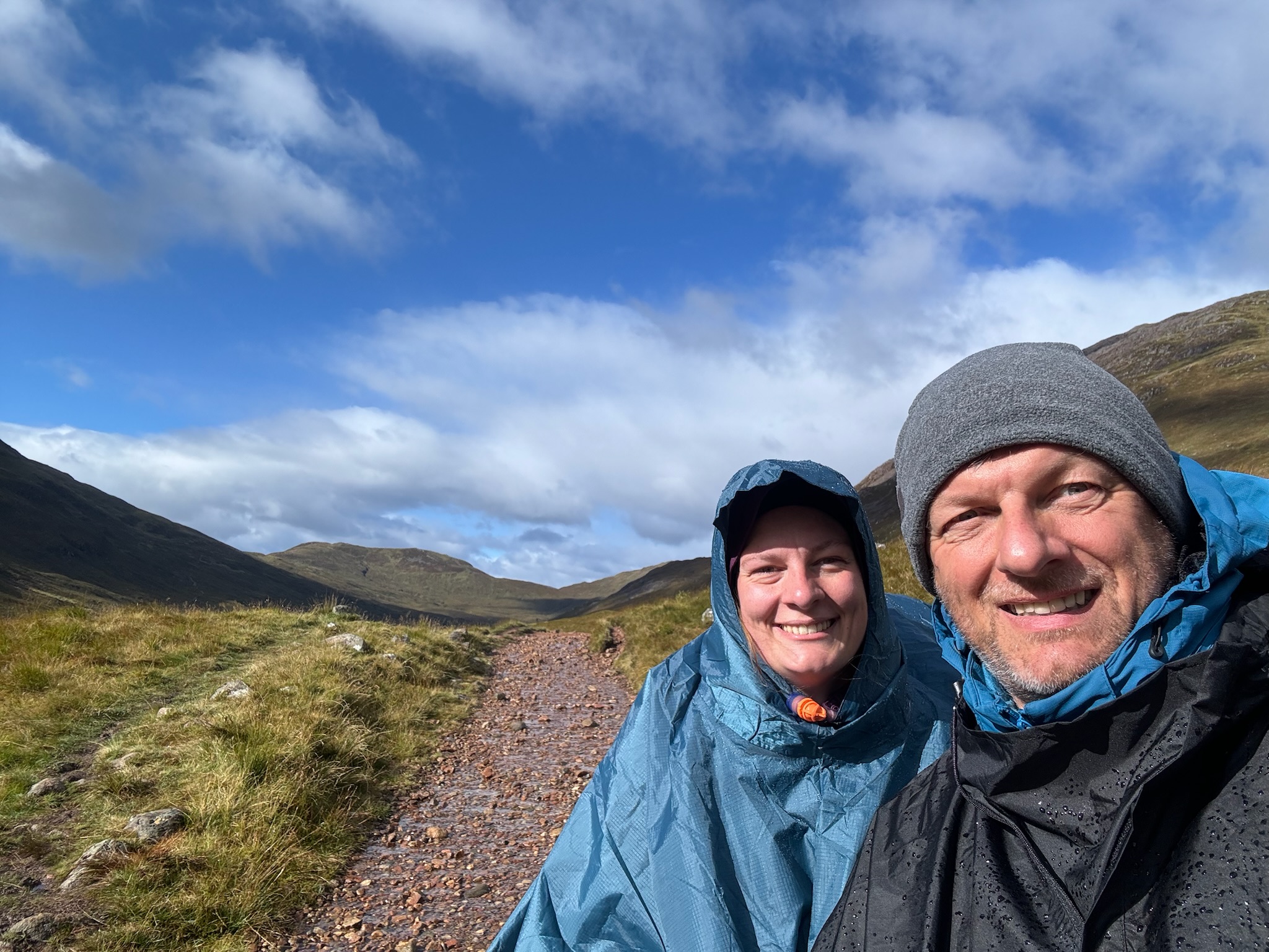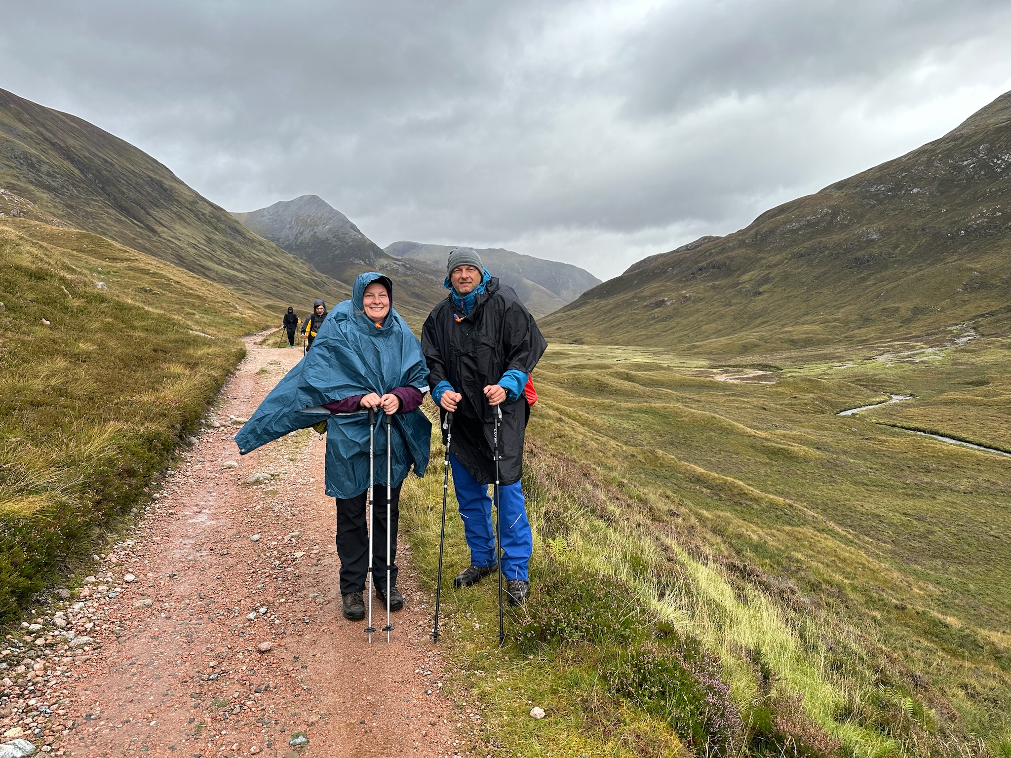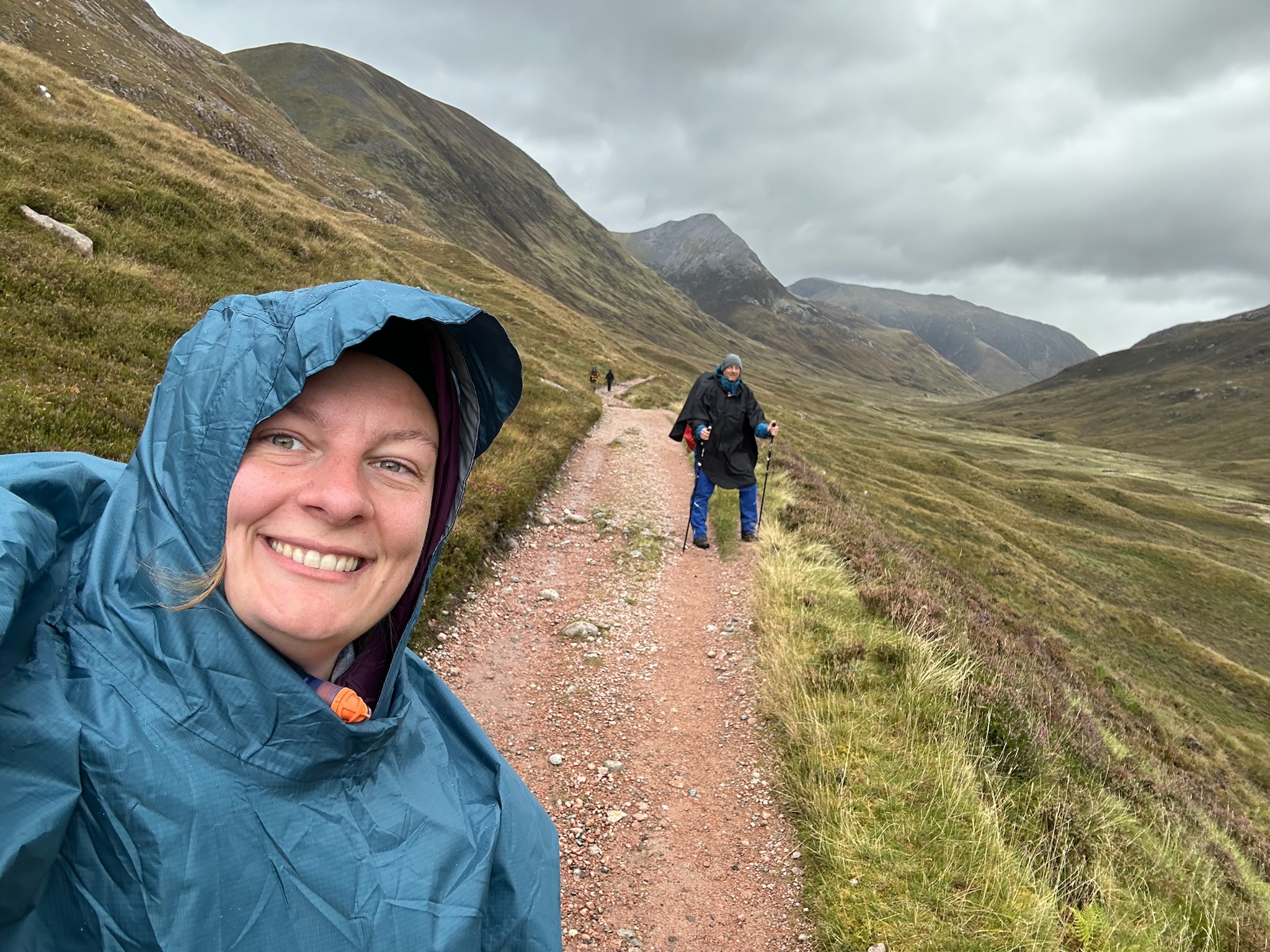 Was anfangs mit Regenjacken und -hosen versucht wurde zu bekämpfen, endete schnell in klatschnassen Schichten darunter. Also setzten wir auf Plan B: Regenponchos. Die Ponchos hielten nicht nur uns und unsere Rucksäcke halbwegs trocken, sondern auch den Wind ab, was uns warm hielt.