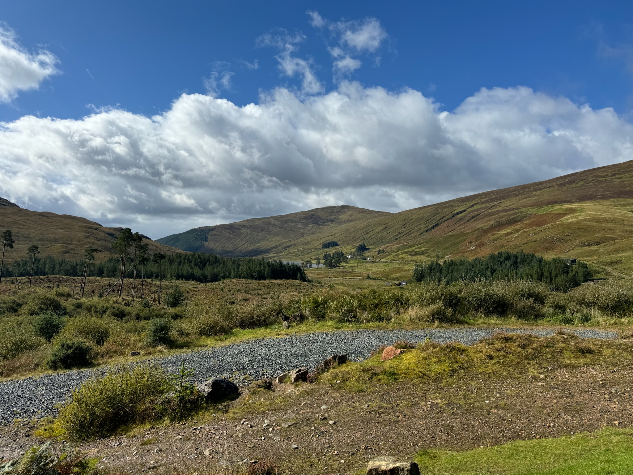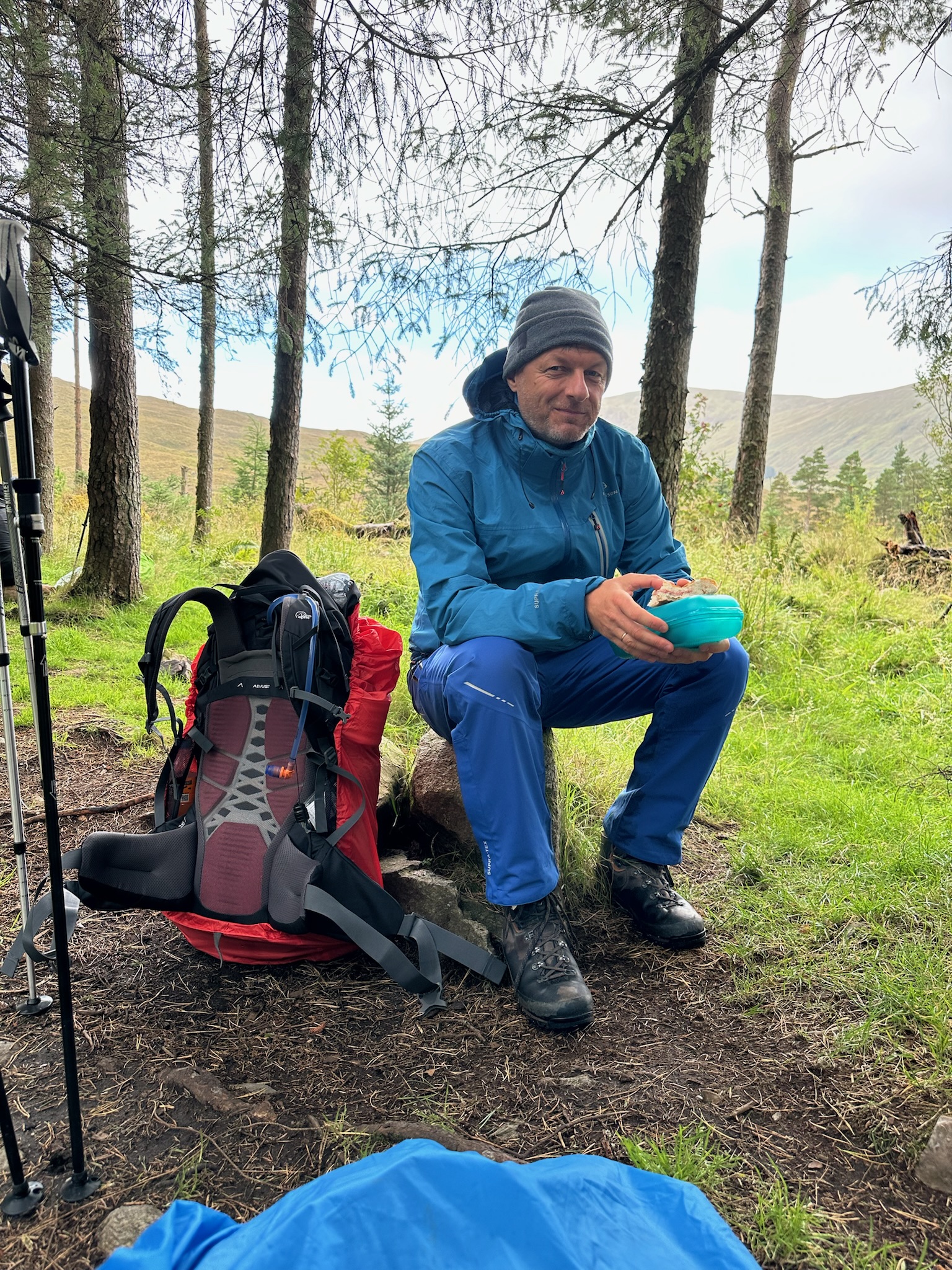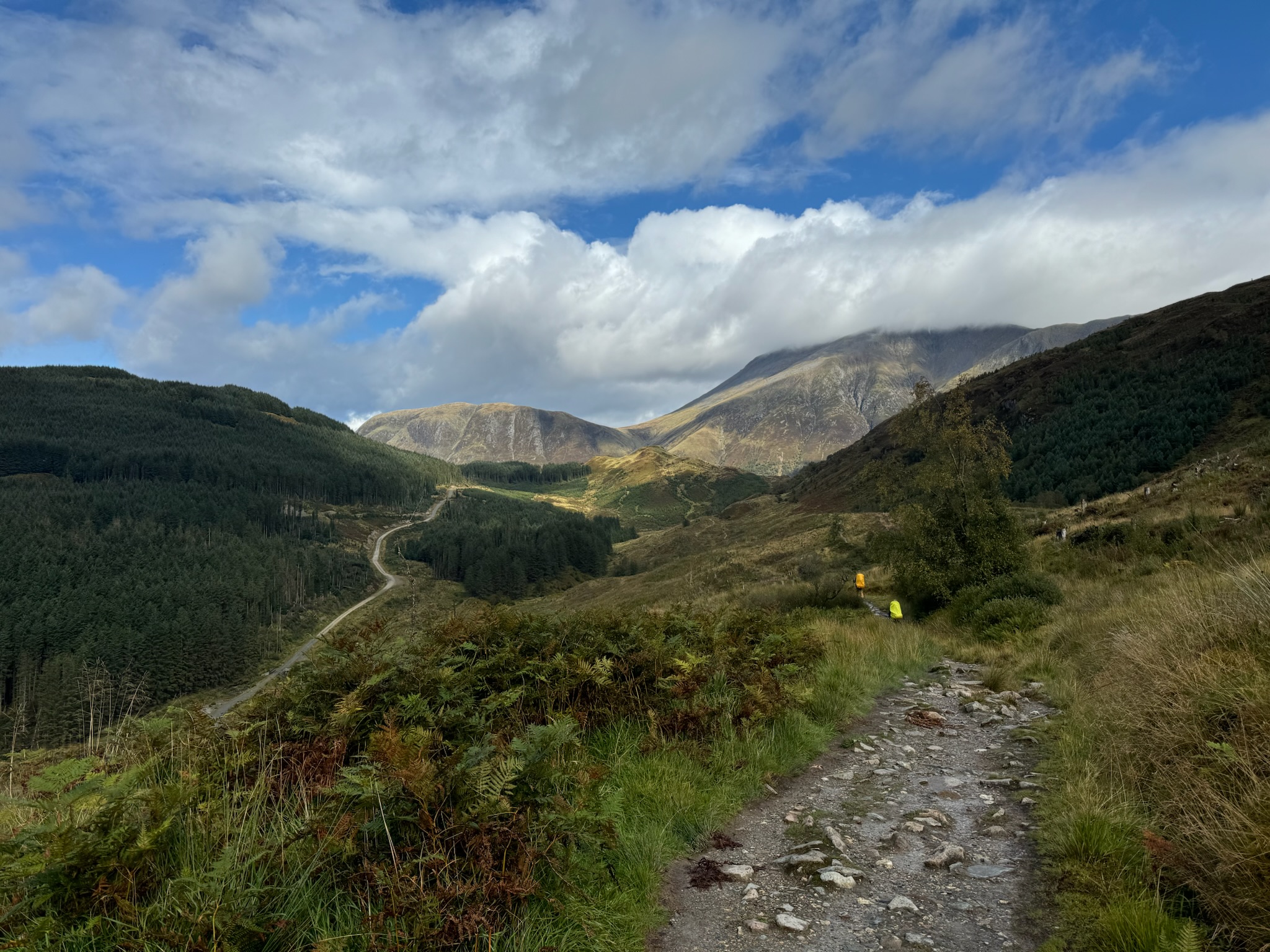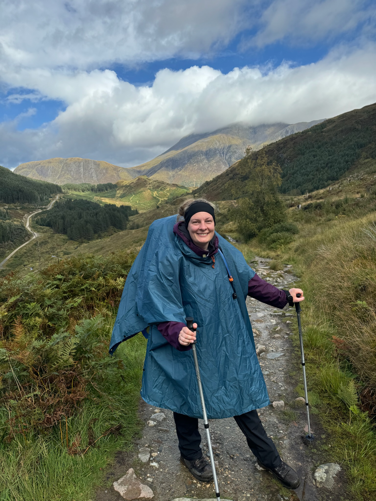 Der zweite Teil der Strecke führte uns über drei kleinere Hügel. Wegen des Regens mussten wir wirklich jeden unserer Schritte gut setzen, um nicht auszurutschen. Während die erste Hälfte des Tages uns das Gefühl gab, durch die Highlands zu wandern, fühlte sich die zweite Hälfte eher wie ein Marsch über Stock und Stein an – vorbei an Wiesen und abgeholzten Wäldern. Schließlich erhaschten wir unseren ersten Blick auf den Ben Nevis, den höchsten Berg Großbritanniens, dessen Gipfel trotz der warmen Temperaturen immer noch schneebedeckt war. Ein spektakulärer Anblick! Leider hüllten Wolken ihn bald wieder ein, und er zeigte sich uns nur noch selten.