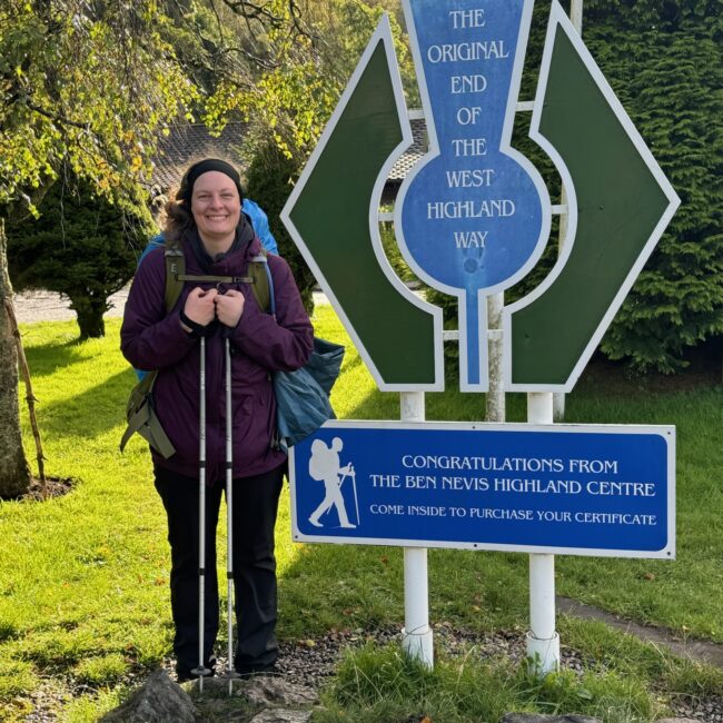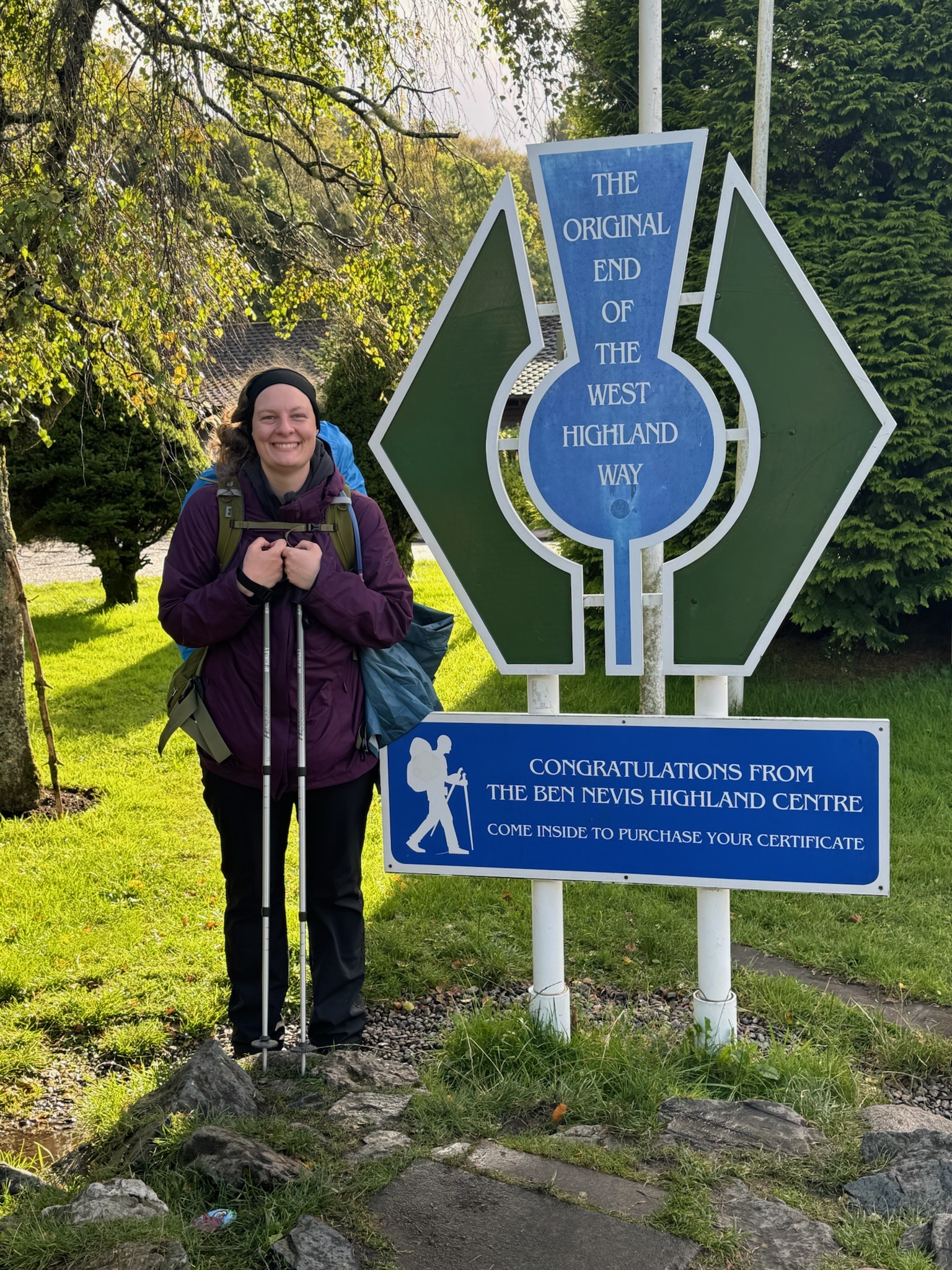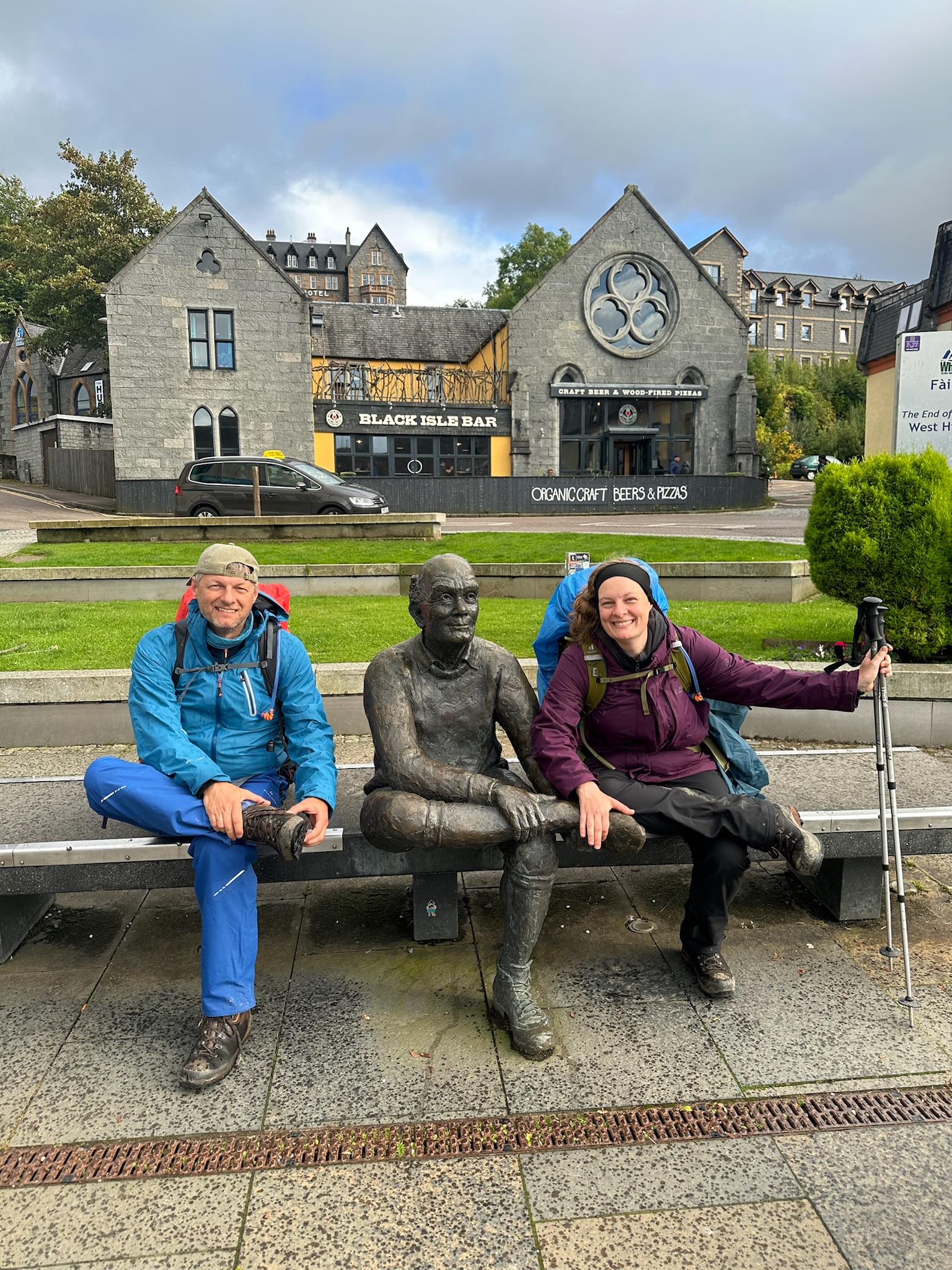 Als wir schließlich in Fort William ankamen, war unser erstes Ziel das ehemalige Ende des West Highland Way: ein unscheinbares blaues Schild am Stadtrand. Ein älterer Herr bot an, ein Foto von uns zu machen. Seine zitternden Hände ließen mich zwar kurz um mein Handy fürchten, aber das Foto ist trotzdem ganz gut geworden.