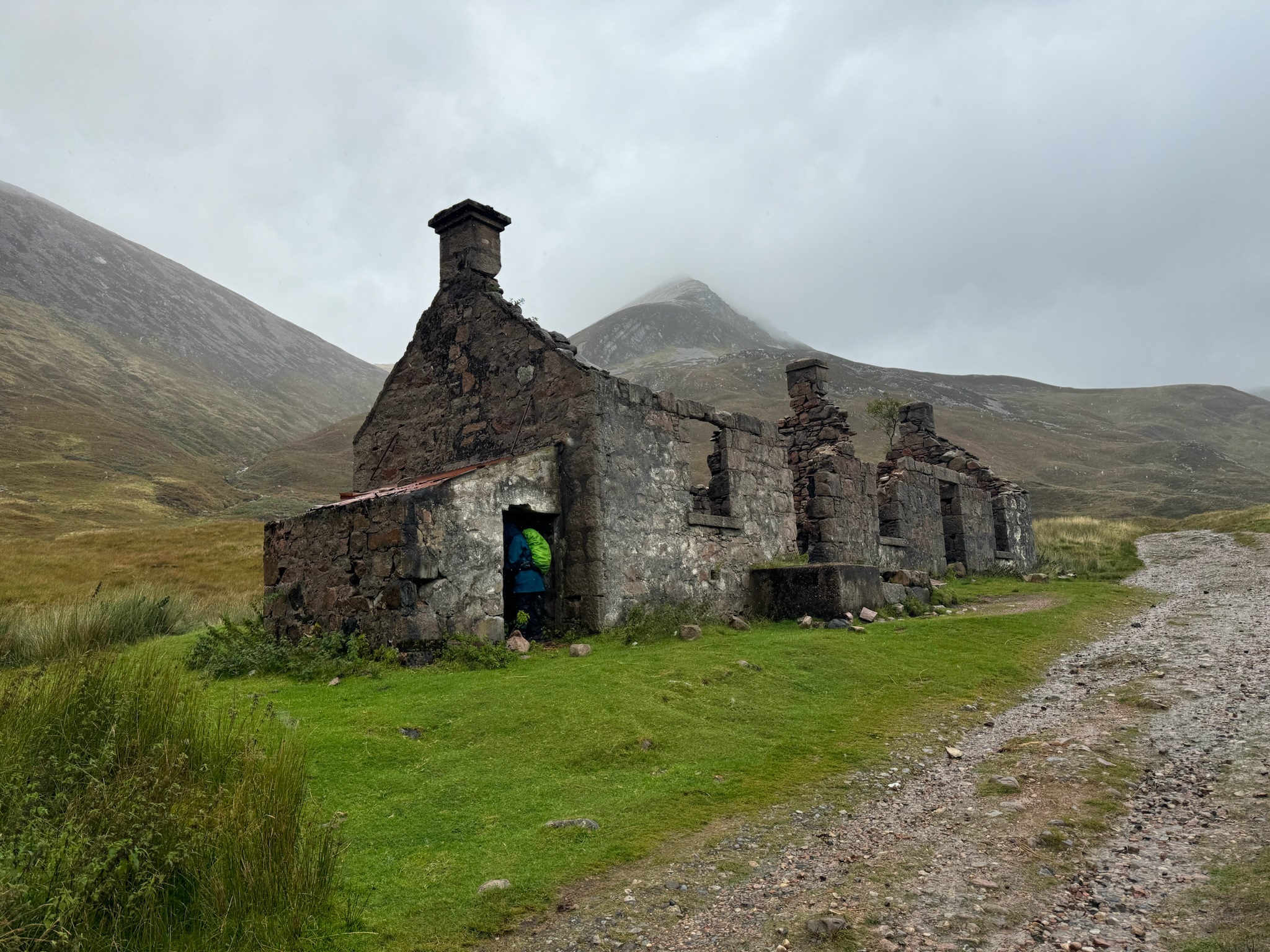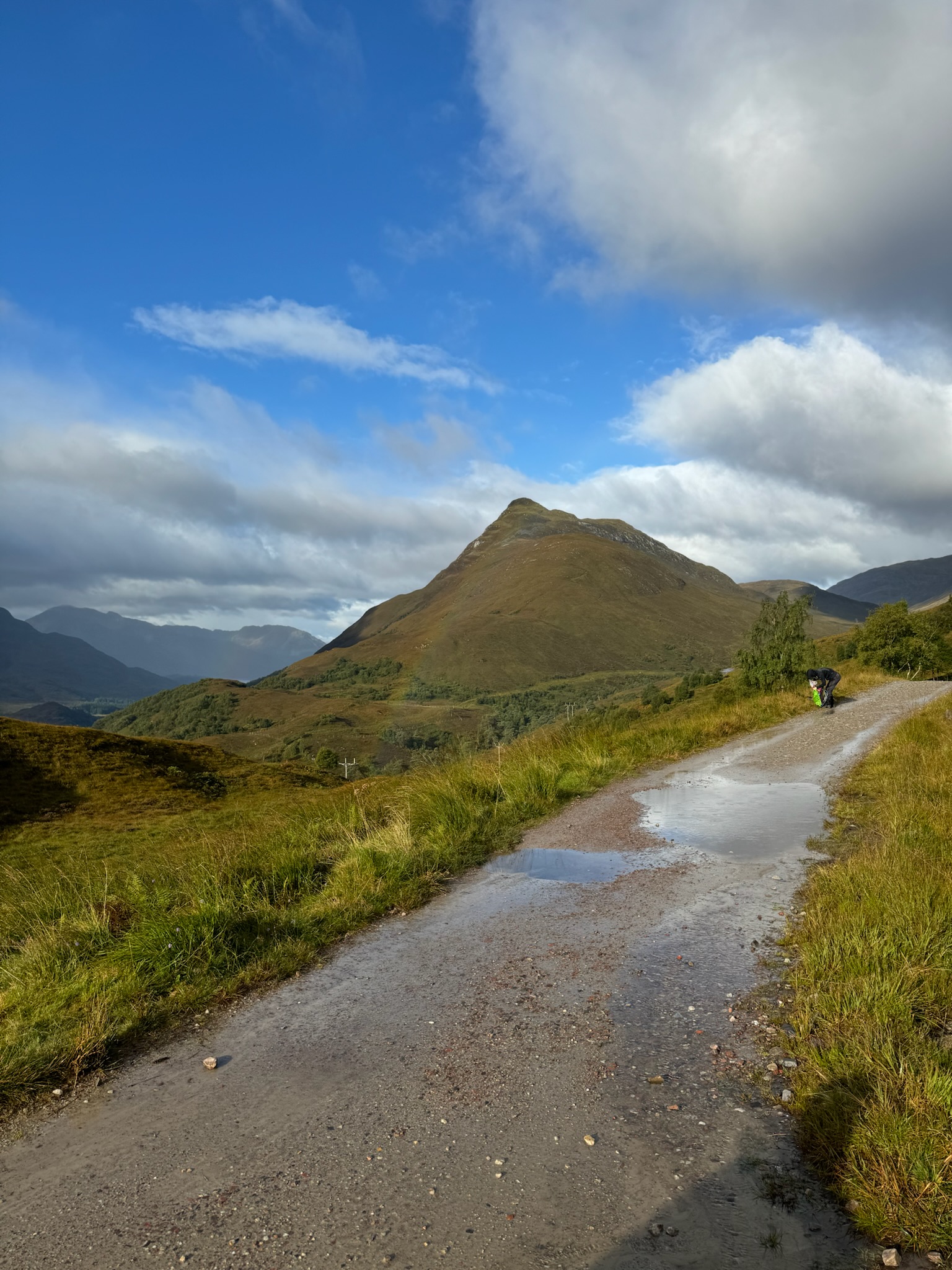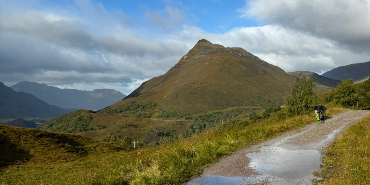 Kurz vor dem Ziel erreichten wir den letzten hohen Punkt unserer Wanderung. Ein letzter Blick auf den Ben Nevis, dann ging es nur noch bergab. Jeder Schritt brachte uns näher an unser Ziel – aber auch näher ans Ende der Reise. Und je näher wir kamen, desto schwerer wurden die Schritte. Papa hatte nasse Füße, bei mir waren mittlerweile alle drei Schichten meiner Kleidung durchnässt. Wir legten eine letzte Pause ein, die auf Fotos vielleicht gemütlich aussieht, tatsächlich aber direkt neben einer Schnellstraße stattfand.